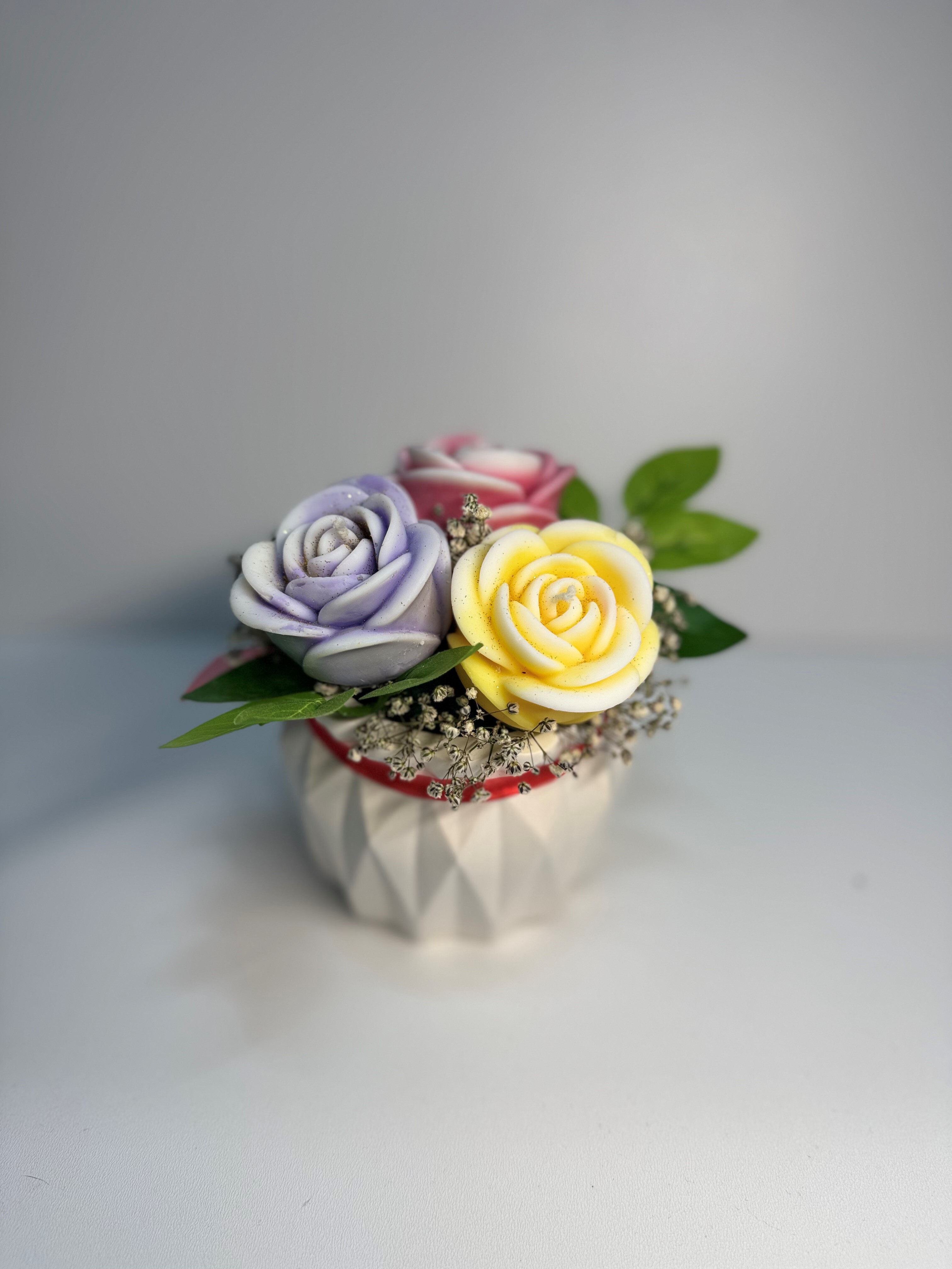 O aranjare uimitoare de flori din ceară, infuzată cu parfum de lavandă, perfectă pentru a adăuga eleganță oricărui spațiu.